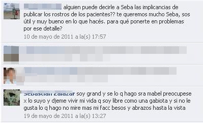 ADEMAS TRACEN DIO QUE YA LE HABÍAN ACONSEJADO AL ENFERMERO NO PUBLICAR LAS FOTOS DE SUS PACIENTES EN FACEBOOK ,A ESTO EL HABÍA RESPONDIDO (QUE AL QUE NO LE GUSTE QUE NO MIRE),ESTA CLARO QUE NADIE DUDA DEL PROFESIONALISMO DE ZALAZAR,PERO MUCHOS DE LOS PACIENTES QUE FUERON RETRATADOS CON EL SE ENCUENTRAN INCONSCIENTE Y OTROS EN ESTADO TERMINAL,LOS FAMILIARES REPUDIARON TOTALMENTE ESTE EPISODIO Y ALGUNOS DE ELLOS YA SE REUNIERON CON SUS ABOGADOS .