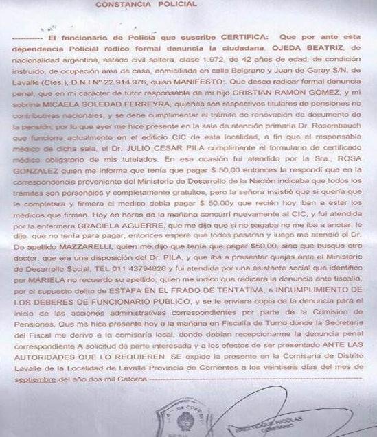 En Lavalle la ciudadana Beatriz Ojeda, acudió al CIC, para hacer la renovación de la pensión no contributiva de su hijo y sobrina. En el centro de salud fue atendida por una enfermera y un medico y indeclinablemente le dijeron que debía abonar un plus de $50 pesos para ser atendida. La mujer puso en conocimiento a las autoridades de Desarrollo Social de la Nación y alegaron que NO DEBE PAGAR y que debe realizar la denuncia correspondiente ante Fiscalía o Policía. A continuación copia de la denuncia penal.